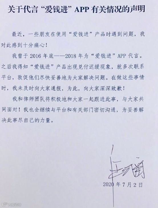 7月2日,汪涵发声明回应代言“爱钱进”APP涉嫌诈骗一事,称曾于2016年-2018年为该APP代言,之后得知“爱钱进”产品出现兑付迟缓现象,就多次联系平台,敦促他们解决问题。在做这些事情时,未及时向大家通报,为此道歉。他和律师团队将积极和大家一起跟进此事,与大家共同面对。
