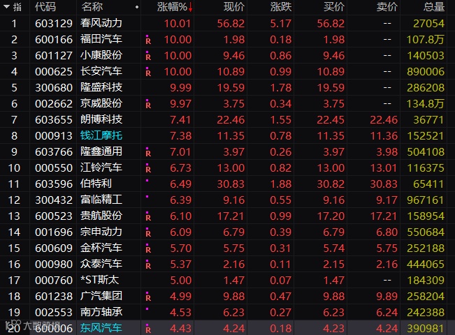 整个汽车板块尾盘狂拉,板块整体市值拉升近300亿元。