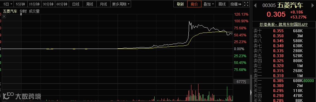 从盘面来看,A股汽车股行情主要是由港股五菱汽车(00305)带动,该股午后涨幅突然放大,创逾两年新高。在A股临近收盘的时候,该股最高股价达到0.45港元,涨幅近120%。这对A股形成了直接刺激。