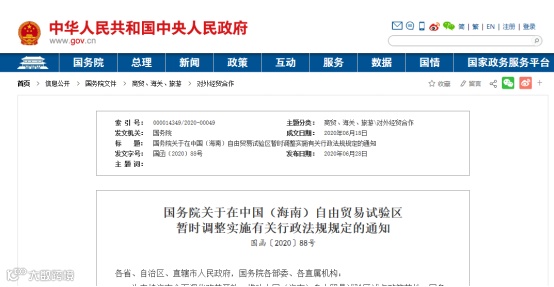 6月28日,国务院发布《关于在中国(海南)自由贸易试验区暂时调整实施有关行政法规规定的通知》,调整实施5部行政法规的部分规定,其中包括对海南自贸区内自驾游进境游艇实行免担保政策,以及部分行政审批权限下放等。