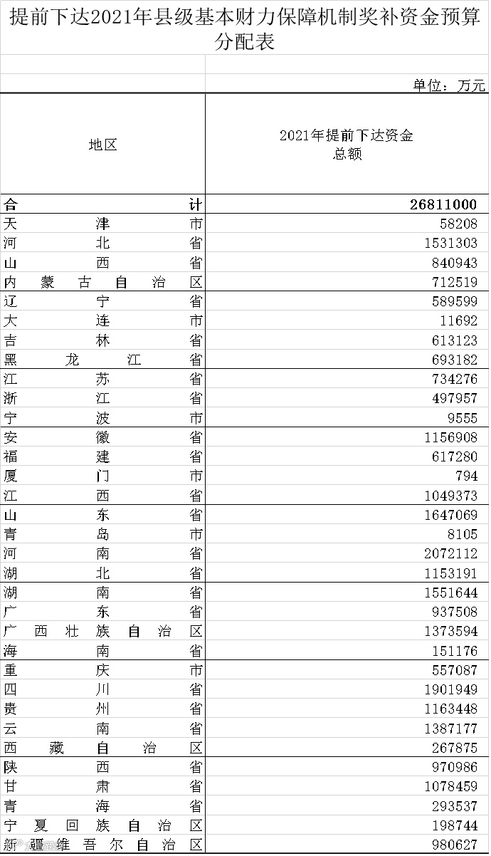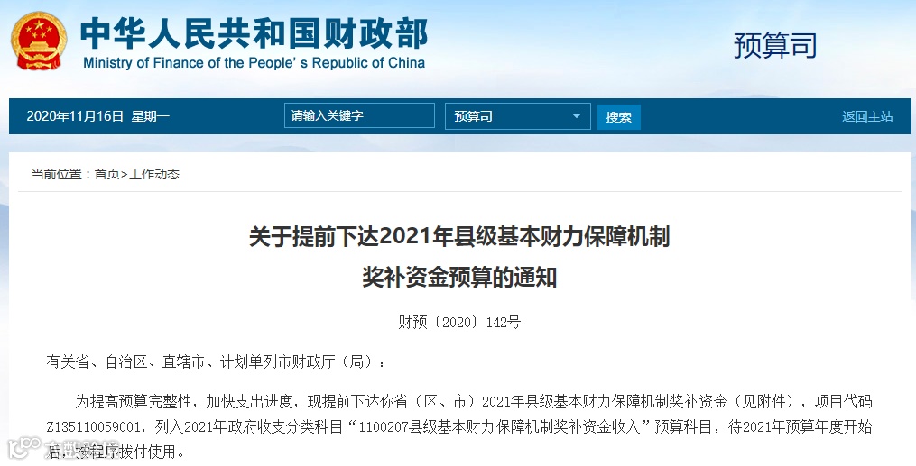 为提高预算完整性,加快支出进度,现提前下达你省(区、市)2021年县级基本财力保障机制奖补资金(见附件),项目代码Z135110059001,列入2021年政府收支分类科目“1100207县级基本财力保障机制奖补资金收入”预算科目,待2021年预算年度开始后,按程序拨付使用。