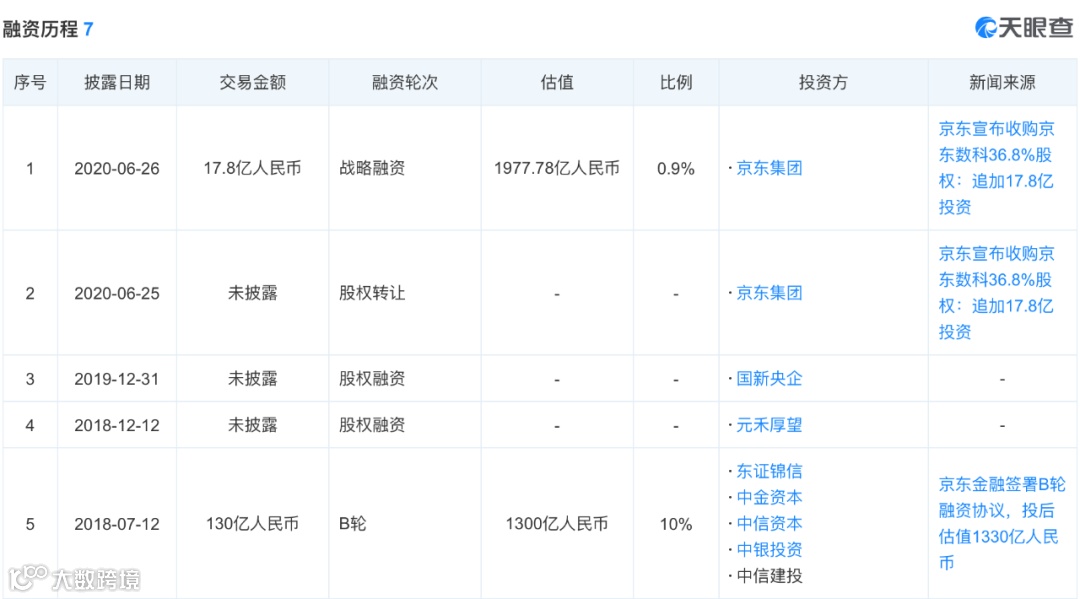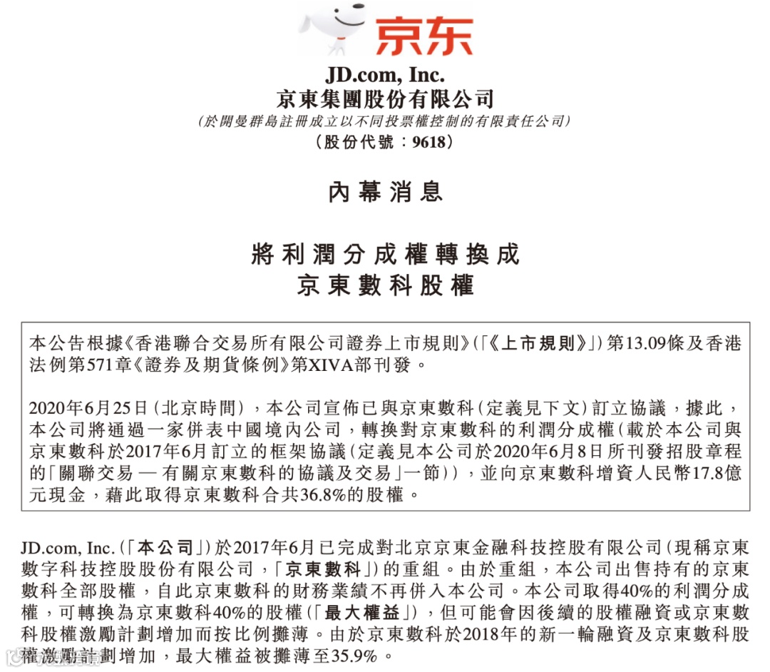 根据当天订立的协议,京东集团将通过一家并表中国境内公司,转换对京东数科的利润分成权(基于双方于2017年订立的框架协议),并向京东数科增资17.8亿元现金,以取得京东数科共36.8%的股权。
