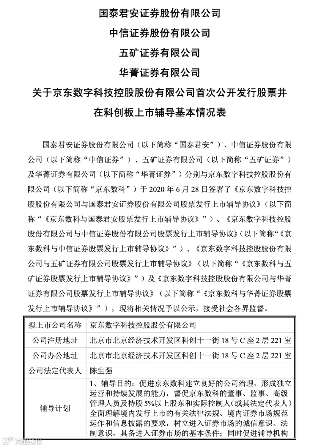 7月1日晚间,北京证监局挂出了京东数科辅导备案信息,这家曾被称作“京东金融”,承载了京东集团金融科技希望的公司,已于6月28日签署了上市辅导协议,计划在国泰君安、中信证券、五矿证券、华菁证券4家券商联手保荐下登陆科创板。