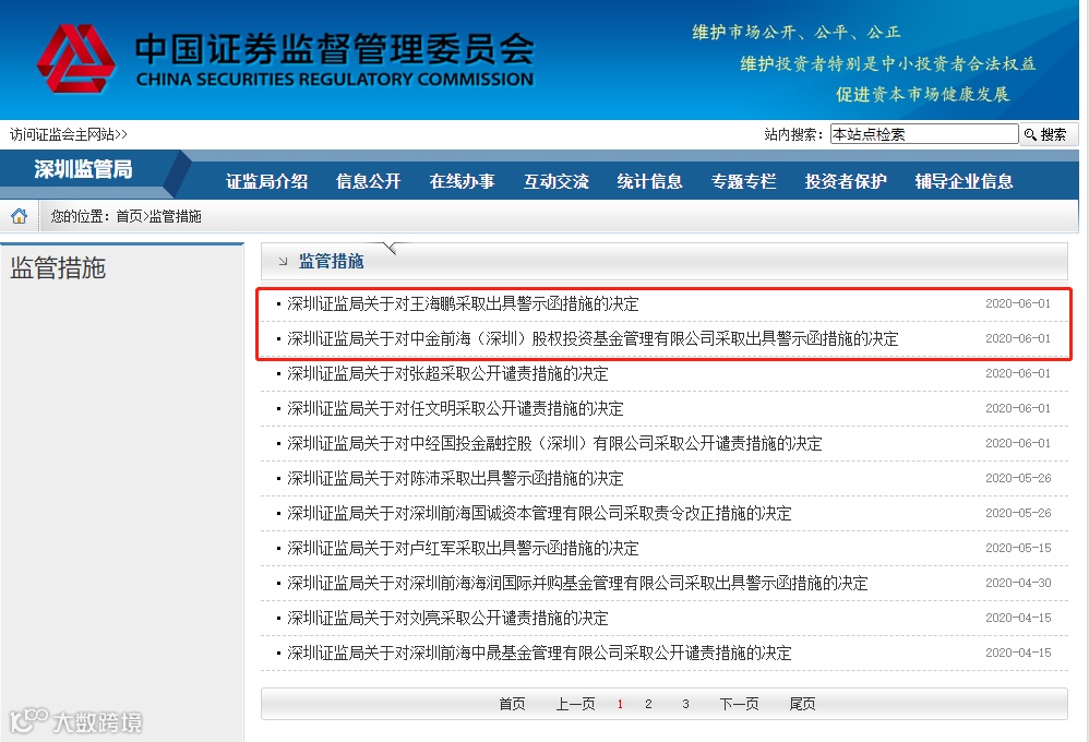 近日,深圳证监局官网挂出对中金前海及其总经理的两份行政监管措施决定。由于该公司在私募基金产品募集与管理过程中,存在未尽职履行谨慎勤勉义务,向投资者承诺投资本金不受损失和承诺最低收益的情形,被深圳证监局采取警示函的行政监管措施。
