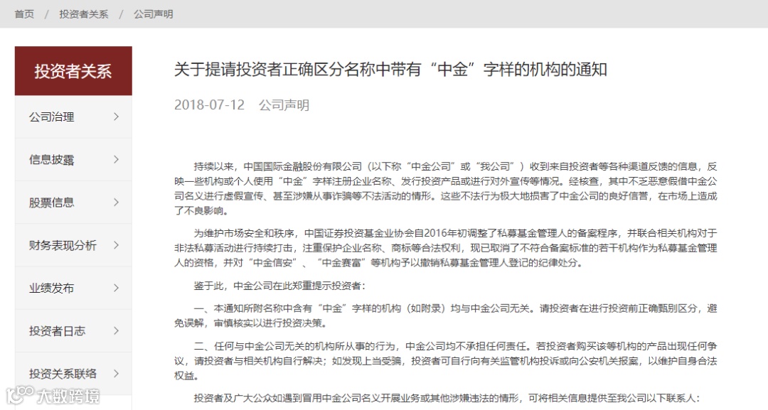 早在2018年,中金公司曾一次性列出165家名为“中金XX”的机构,并宣布相关公司均与中金无关。彼时,中金公司称,其中不乏恶意假借中金公司名义进行虚假宣传、甚至涉嫌从事诈骗等不法活动的情形,极大地损害了中金公司的良好信誉,在市场上造成了不良影响。