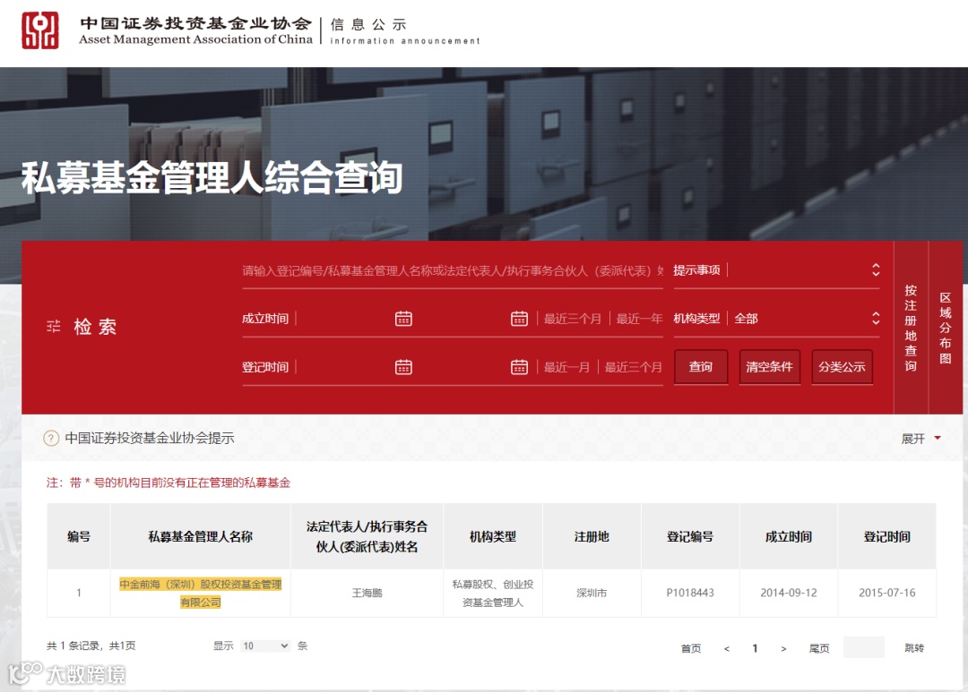 中基协信息显示,中金前海成立于2014年9月,于2015年7月办理登记,注册资本为1500万元,其中实缴资本1100万元,机构类型为私募股权、创业投资基金管理人,在2016年7月成为中基协的观察会员。目前,中金前海在中基协登记有20只基金信息,全部为股权投资基金。