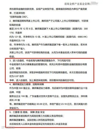 此外,该“项目亮点”还强调,中金前海与腾邦集团强强合作,下行风险可控。中金前海作为此次募集基金的管理机构,将充分利用中国国际金融控股股份有限公司(此处疑为笔误,应为中国国际金融股份有限公司)、前海金控等股东的优势,采取多种措施将项目下行风险降到最低。本次交易投前估值仅为0.87倍市净率,进入估值低,加上集团保底回购,项目整体风险偏低且可控。