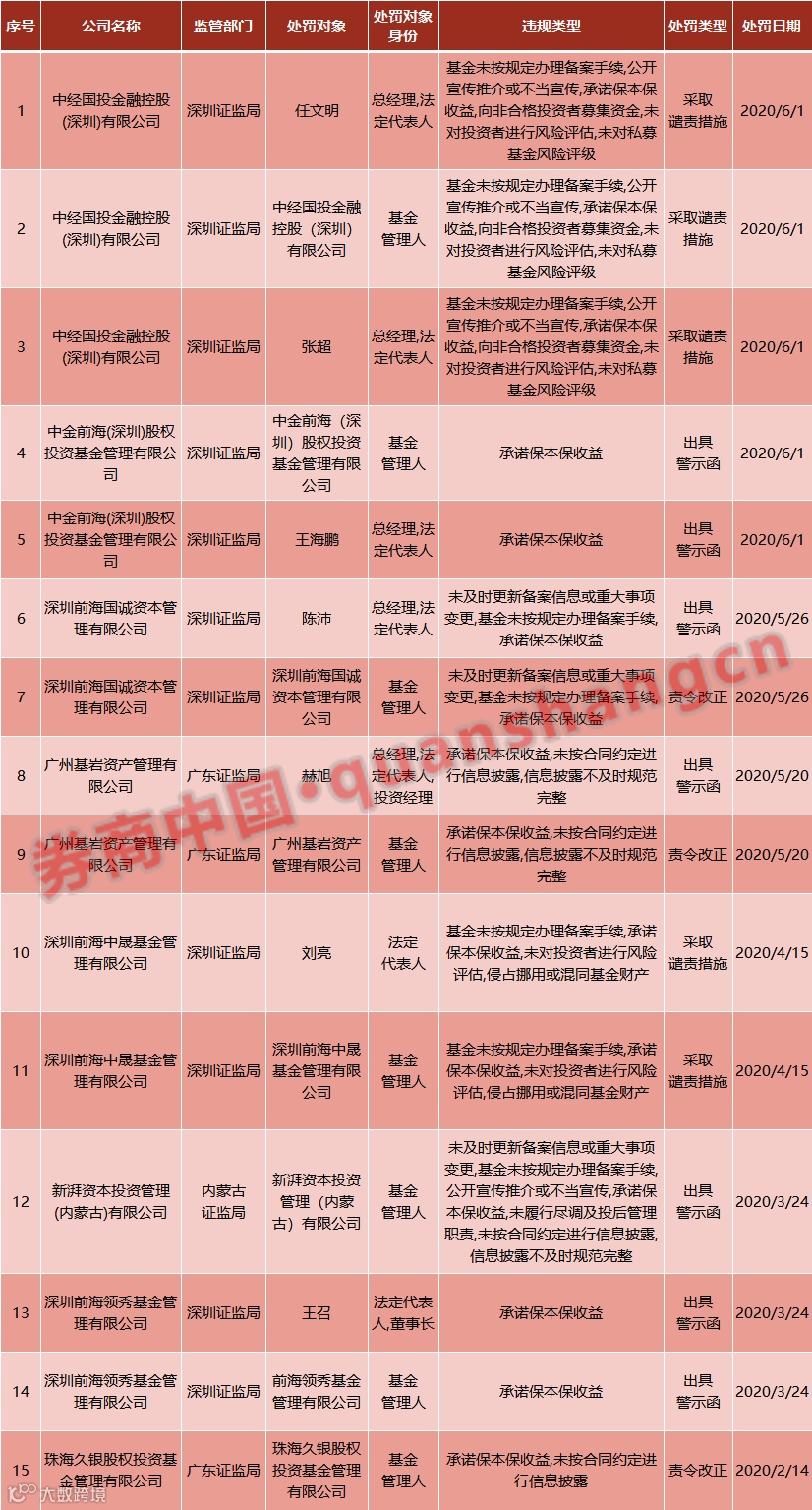 就今年以来各地证监局的罚单情况来看,深圳证监局、广东证监局、内蒙古证监局等均因承诺保本、保收益等问题对辖区内私募机构及主要负责人开出行政监管措施,从责令改正、出具警示函到公开谴责不等。