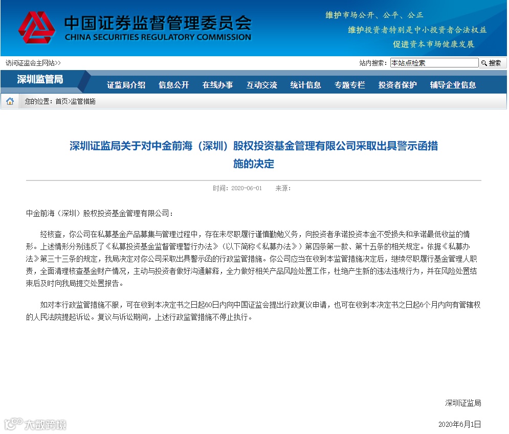 6月1日,深圳证监局官网挂出对中金前海及其总经理的两份行政监管措施决定。深圳证监局指出,中金前海在私募基金产品募集与管理过程中,存在未尽职履行谨慎勤勉义务,向投资者承诺投资本金不受损失和承诺最低收益的情形,因此对其采取警示函的行政监管措施。