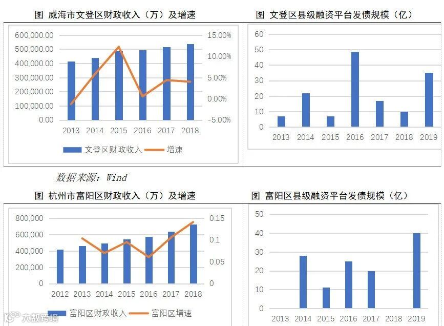 总结来看,文登区和富阳区在“撤县设区”后,财政收入未出现明显下滑,但增速有所放缓。从县级平台发债规模来看,“撤县设区”后,由于原县级政府财政自主性下降,县平台发债规模短期内有所减少。但随着2016年融资平台监管政策宽松,进入平台公司发债规模翻倍增长阶段,文登区、富阳区内平台也很快恢复了发债规模,且2019年两家平台公司发债规模都再创新高,说明除了辖区政府财政自主权外,市场监管政策也是影响平台发债的重要因素。
