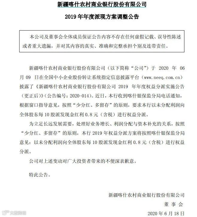 6月18日,喀什银行公告称,接到监管部门窗口指导,按照“少分红、多留存”的原则,要求该行以未分配利润向股东每10股派现0.8元(税前)进行权益分派。