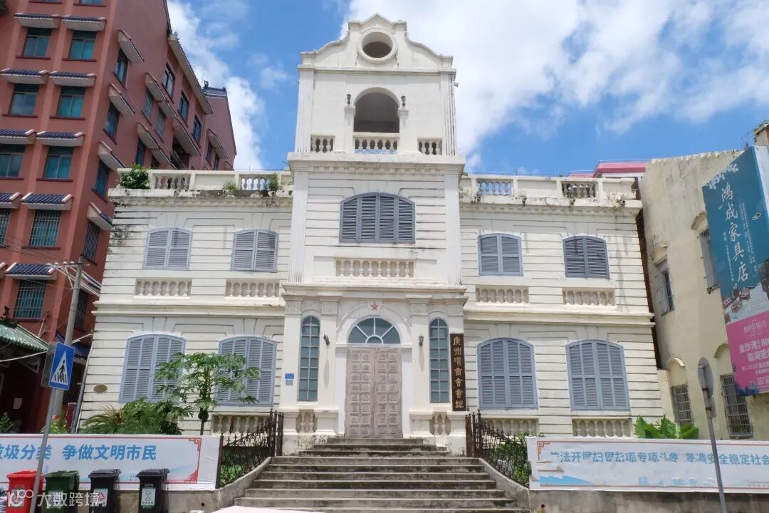 位于民主路上的广州湾商会馆,1925年竣工建成,是赤坎当时最豪华的现代建筑。同年成立广州湾商会,是粤西地区最大的商会。会馆顶层有一钟楼,不单位市民报时,还为过往赤坎海边的航船提供时刻,见证了赤坎古埠的商旅盛况。1991年湛江市人民政府将其列为重点文物保护单位。