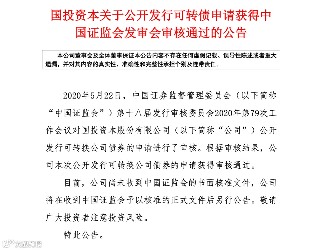 公告显示,5月22日,国投资本公开发行80亿元可转债的申请,获得证监会发审委审核通过,目前尚未收到中国证监会的书面核准文件。