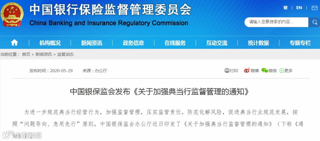 为进一步规范典当行经营行为,加强监督管理,压实监管责任,防范化解风险,促进典当行业规范发展,按照“问题导向、急用先行”原则,银保监会办公厅5月29日印发了《关于加强典当行监督管理的通知》(下称《通知》)。