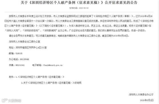 6月2日,记者从深圳市人大常委会网站获悉,深圳市人大常委会办公厅就《深圳经济特区个人破产条例(征求意见稿)》公开征求意见。