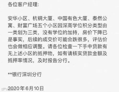 六月中旬,一则通知在银行内部流传:安华小区、杭钢大厦、中国有色大厦、泰然公寓、财富广场五个小区因深高学位积分类型由一类划分为三类,没有学位的加持,房价下降已是事实,后续的成交价可能会跌很多,评估价也会做相应的调整。请各位客户经理检查一下手中贷款有无上述小区的抵押物,如有请核实贷款金额及抵押率情况。