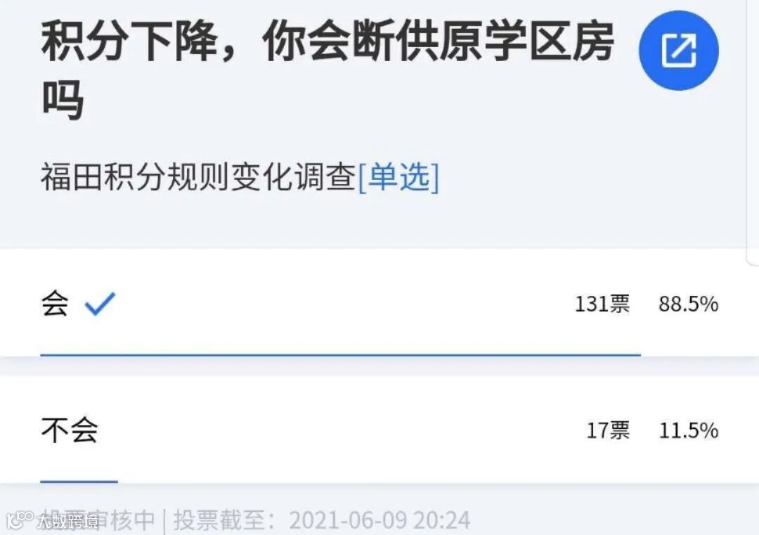 六月初,在一个群成员为300人的某单身公寓类的业主群内,曾发起过一项投票。就“积分下降,你会选择断供原学区房吗?”这一问题,有近半数人参与投票,其中八成业主选择"会断供"。在此基础上,有一半选择断供的业主在贷款余额选项中投了票,“贷款金额在200~300万”的占三分之一。