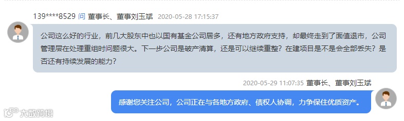 例如,有投资者提问称,“下一步公司是破产清算,还是可以继续重整?在建项目是不是会全部丢失?是否还有持续发展的能力?”对此,盛运环保董事长仅称,其公司正在与各地方政府、债权人协调,力争保住优质资产。