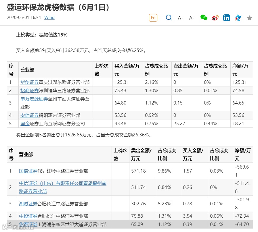 由于当日振幅达到20.69%,盛运环保也因此登上6月1日龙虎榜。数据显示,当日盛运环保买入金额前5名买入总计362.58万元,占当天总成交金额6.25%;卖出金额前5名卖出总计1526.65万元,占当天总成交金额26.36%。其中,国金证券上海互联网证券分公司成为唯一机构客户。