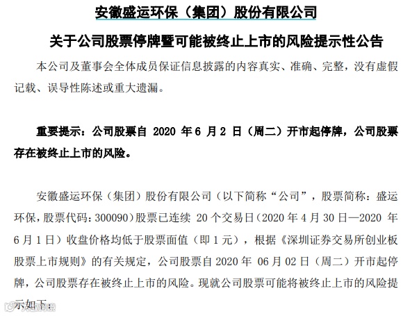 6月1日晚间,盛运环保发布公告称,其股票已连续20个交易日(4月30日—6月1日)收盘价格均低于股票面值(即1元),根据规定,其股票自6月2日(周二)开市起停牌,股票存在被终止上市的风险。