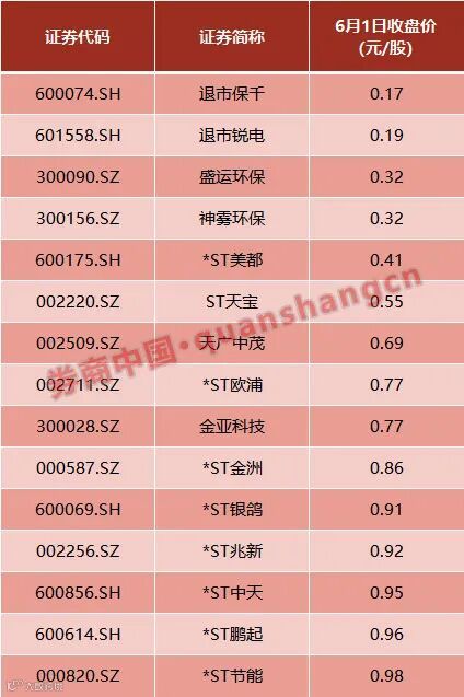 目前,沪深两市共有15只个股股价低于1元。其中,退市保千和退市锐电两只股价已分别停在0.17元和0.19元,等待退市整理期,盛运环保和神雾环保紧随其后。神雾环保也已因连续20天股价低于面值而触发面值退市,已停牌等待交易所的最终决定。