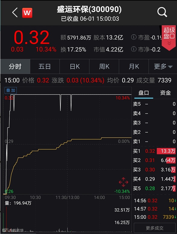 然而,在第20个交易日中,盛运环保却喜提“地天板”。在6月1日开盘跌停后,数笔买入大单将其股价直接拉至涨停。截至收盘,盛运环保仍稳稳地保持涨停状态,当日收盘价为0.32元/股。