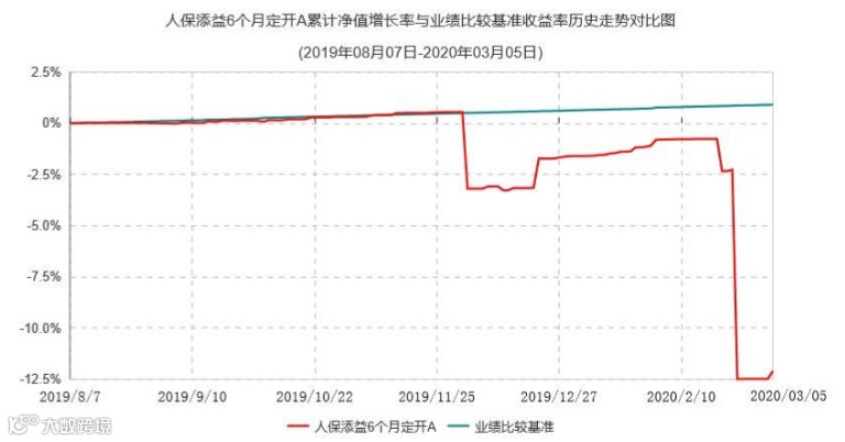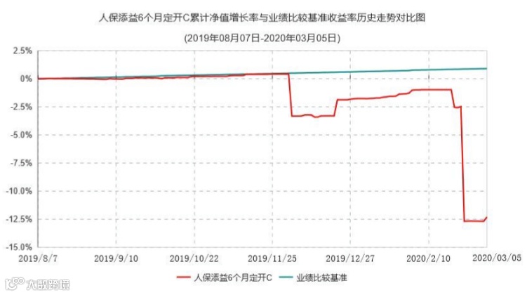 根据该基金2019年年报,从2019年8月7日成立到2019年末的期间内,人保添益6个月定开A基金份额净值增长率为-1.60%,比业绩比较基准(0.63%)差了2.23个百分点。人保添益6个月定开C基金的表现(净值增长率-1.76%),也比业绩基准要差2.39个百分点。