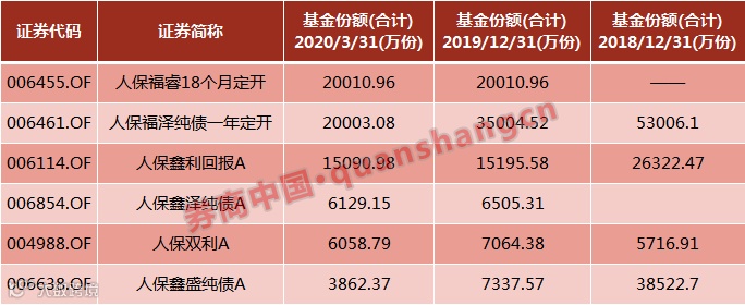 人保添益6个月定开债券基金、人保鑫泽纯债基金、人保鑫利回报债券基金、人保鑫盛纯债债券基金、人保纯债一年定期开放债券基金、人保鑫裕增强债券基金、人保双利优选混合型基金、人保福睿18个月定期开放债券基金、人保福泽纯债一年定期开放债券基金等。