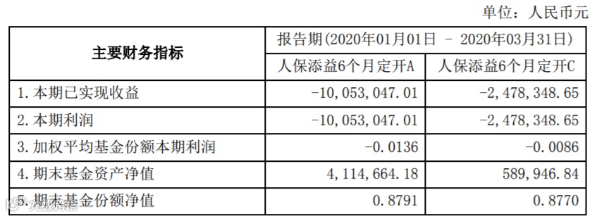 根据该基金2020年一季报,截至2020年3月5日的基金最后运作日,人保添益6个月定开A基金份额净值为0.8791元,报告期内,该类基金份额净值增长率为-10.66%,同期业绩比较基准收益率为 0.28%;人保添益6个月定开C基金份额净值为0.8770元,本报告期内,该类基金份额净值增长率为-10.73%,同期业绩比较基准收益率为0.28%。