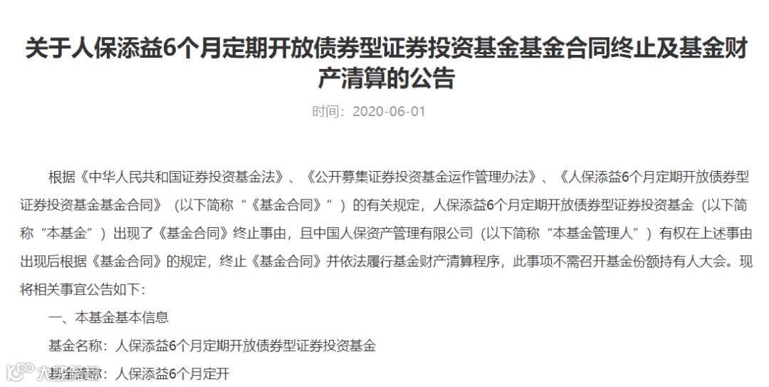 据了解,自2020年6月1日起,“人保添益6个月定开债券基金”进入清算程序。
