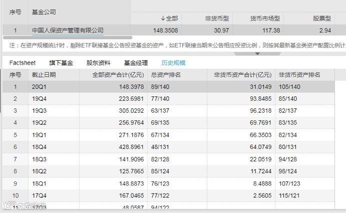 人保资产的整个公募基金管理规模也直线缩水。根据wind数据,一季末人保资产公募基金资产规模为148亿,在140家基金管理人中排名89位;其中,非货币资产规模仅31亿,在140家基金管理人中排名105位。一季末的公募管理资产较年初的224亿,缩减了三分之一;更比其2018年末高点时的429亿元,规模缩减了280亿,缩减幅度达到65%;2018年末时,人保资产公募规模在131家基金管理人中排名达到48位。