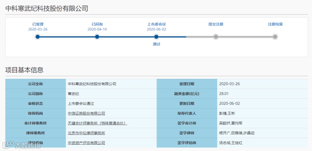 6月2日,科创板上市委发布2020年第33次审议会议结果公告,寒武纪首发上市获得通过。其保荐券商为中信证券,此次IPO拟融资金额为28.01亿元。