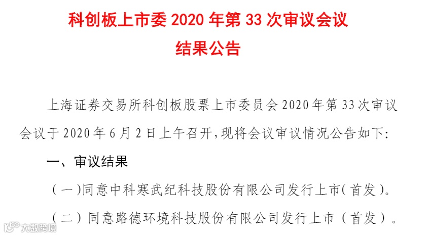 6月2日,科创板上市委发布2020年第33次审议会议结果公告,寒武纪与路德环境两家企业科创板首发上市均获得通过。