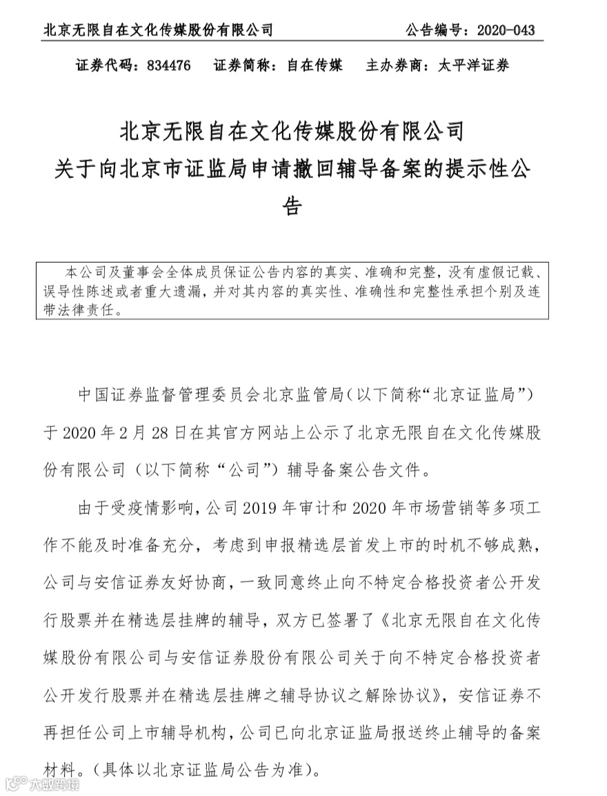 这将成为首个终止精选层辅导备案的企业,自在传媒在今年2月向北京证监局申请辅导备案。