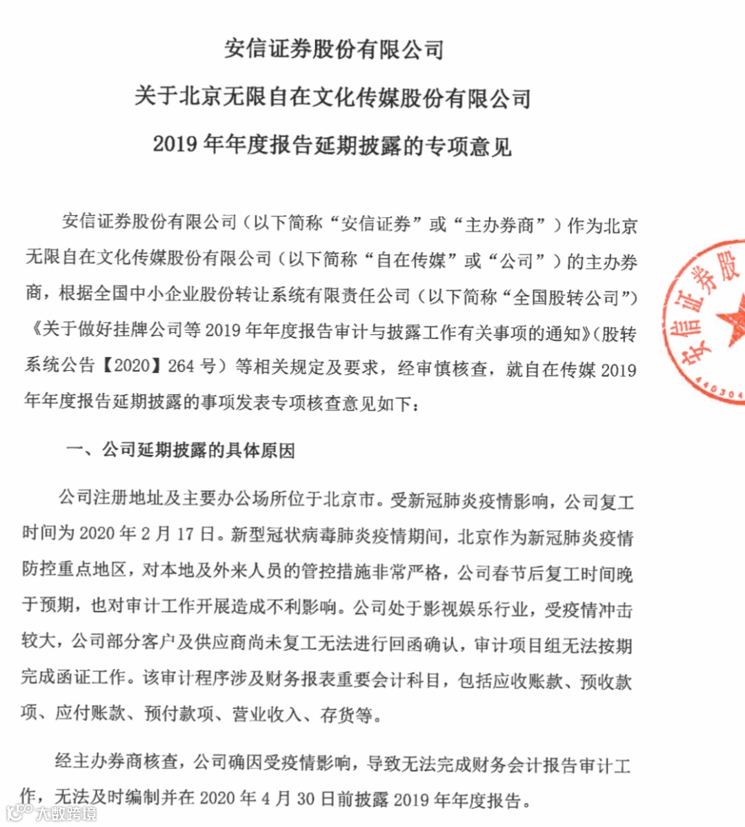 今年4月,自在传媒发布公告延期披露年报,主要因为疫情期间,北京作为防控重点地区,对本地及外来人员的管控措施非常严格。另外该公司为影视娱乐行业,受疫情冲击较大,部分客户和供应商无法进行回函确认。截至目前,自在传媒还未披露2019年年报。