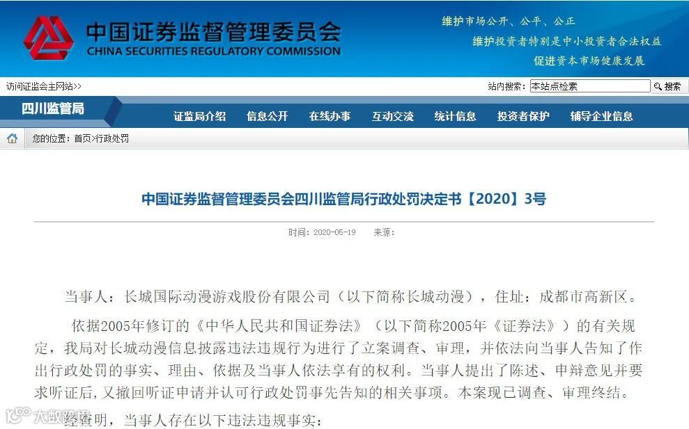 基于以上三点问题,四川证监局对长城动漫责令改正,给予警告,并处以40万元罚款。不过,虽然该行政处罚在5月15日作出、5月19日公示,截至发稿,长城动漫仍未就这一处罚进行信息披露。