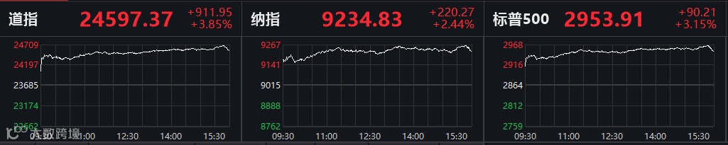 周一,道指涨3.85%,报24597.37点,涨逾900点;标普500涨3.15%,报2953.91点,纳指涨2.44%,报9234.83点。截至收盘,道指已经是连涨三天,涨幅达1350点。