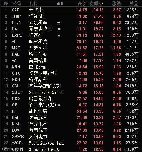 美股已连涨三日,周一道指收涨逾900点,纳指涨2.44%,标普500指数涨3.15%。波音收涨近13%,领涨道指。航空股大涨,Azul涨32.62%,达美航空涨近14%,西南航空涨13.39%。银行股和石油股也纷纷大涨,花旗集团涨近9%,埃克森美孚涨近8%。美国大型科技股多数收涨,苹果涨2.36%,亚马逊涨0.68%,谷歌涨0.88%,Facebook涨1.1%,微软涨0.96%。可以说,热门美股呈现全线大涨的格局。