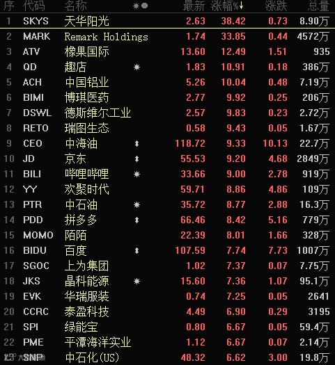 热门中概股也集体上涨,阿里巴巴涨5.71%,京东涨9.2%,百度涨7.74%;蛋壳公寓涨20.38%,橡果国际涨12.49%,趣店涨11.52%,蘑菇街涨9.52%,哔哩哔哩涨9%,拼多多涨8.42%,蔚来汽车涨7.12%。