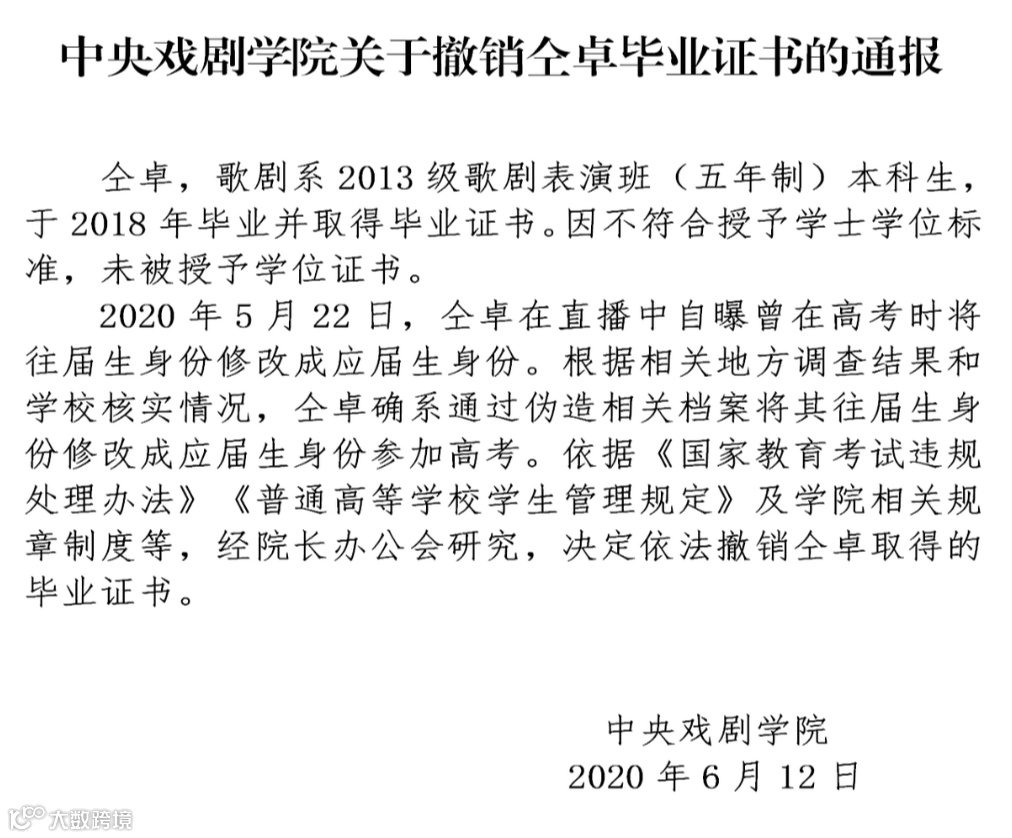 同天,中央戏剧学院决定撤销仝卓的毕业证书。