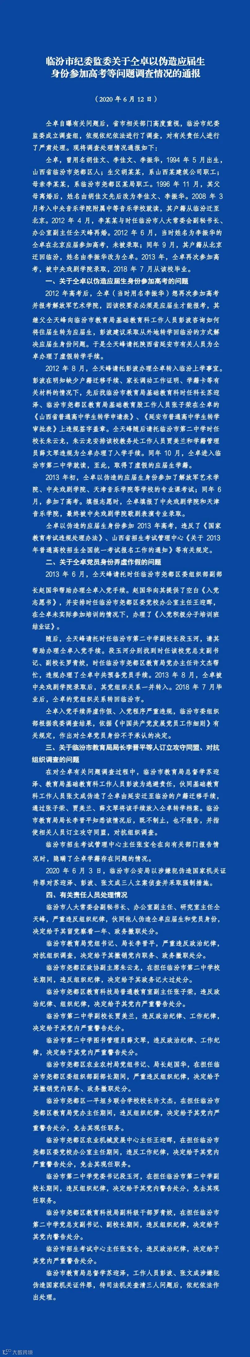 同天,山西省临汾市纪委监委发布关于仝卓以伪造应届生身份参加高考等问题调查情况的通报。调查发现,除了伪造应届生身份外,仝卓入党也存在弄虚作假,且多名相关责任人订立攻守同盟对抗组织调查。