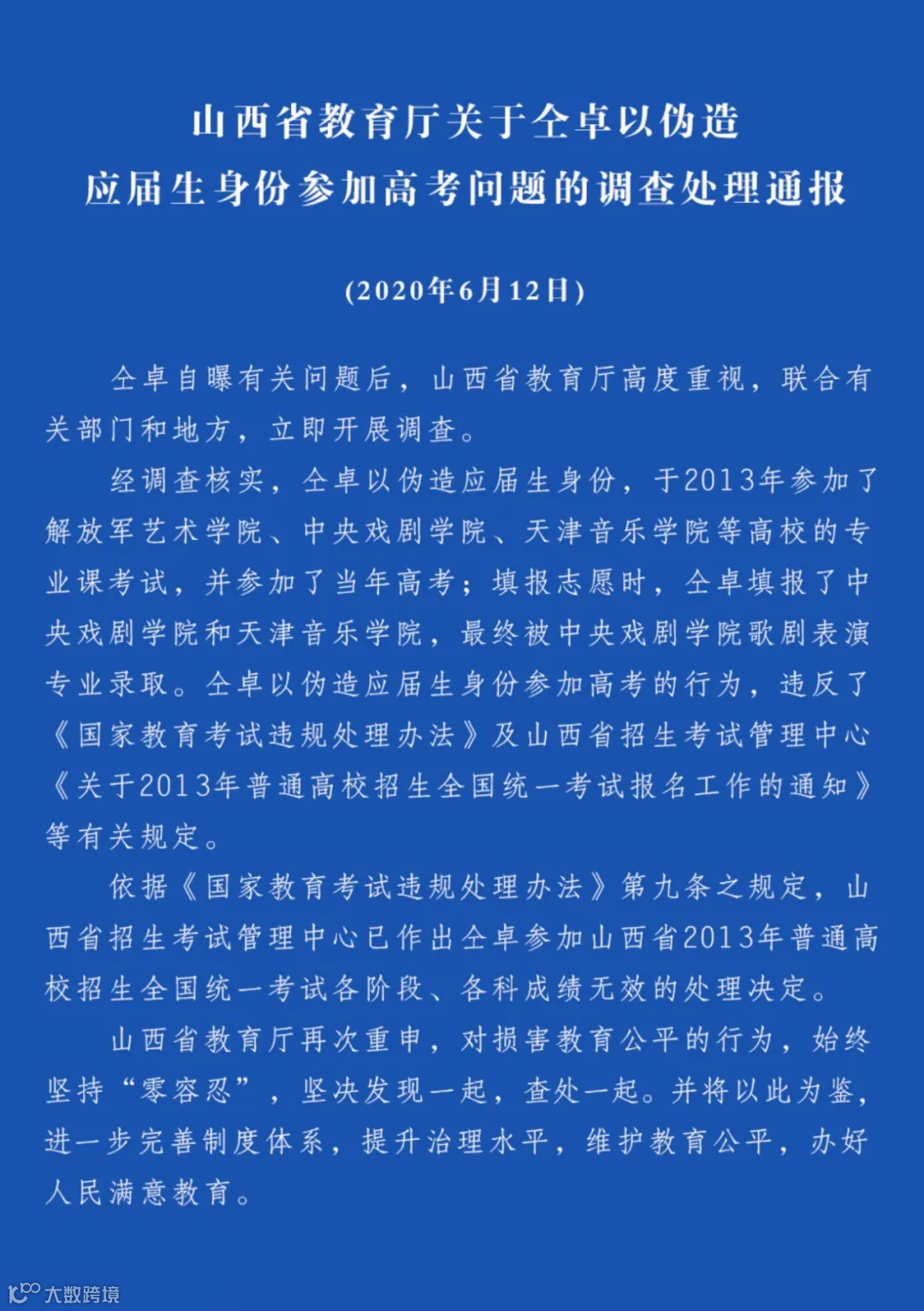 山西省教育厅12日在官方微信公众号发布《关于仝卓以伪造应届生身份参加高考问题的调查处理通报》。通报指出,山西省招生考试管理中心已作出仝卓参加山西省2013年普通高校招生全国统一考试各阶段、各科成绩无效的处理决定。