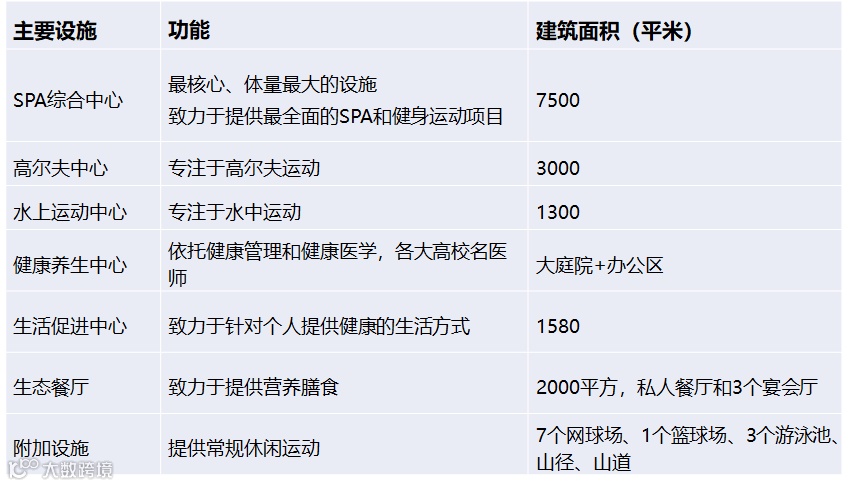 广泛服务于亚健康群体,少量项目针对慢性病人群提供一系列度假养生服务,包括温泉水疗、传统和新型医疗、行为治疗、精神疗法、健身、营养以及美容等。