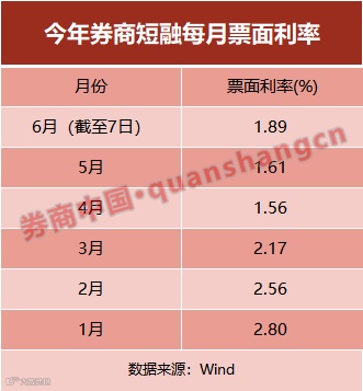 自今年3月下旬以来,券商短融利率跌破2%。根据券商中国记者对券商短融利率的分析,3月平均利率还在2%以上(2.17%),4月下跌至1.56%,5月为1.61%。6月截至7日的平均值为1.89%。