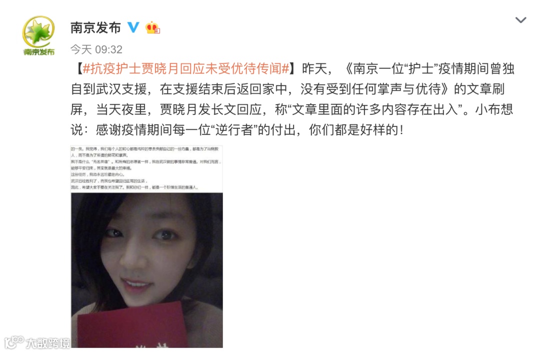 4月27日,互联网上一篇《南京一位“护士”疫情期间曾独自到武汉支援,在支援结束后返回家中,没有受到任何掌声与优待》的文章刷屏。4月27日夜,贾晓月本人发长文回应,称“文章里面的许多内容存在出入”。