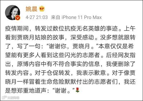 姚晨表示,她要为自己仓促转发的行为表示歉意。同时,姚晨还称要对向贾晓月这样冒着生命危险默默付出的志愿者们郑重道谢。