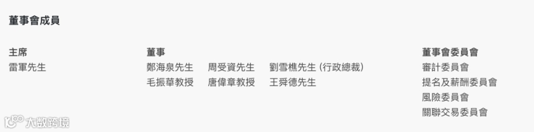 官网信息显示,小米科技创始人、董事长雷军任天星银行董事局主席。其他董事会成员包括郑海泉、周受资、刘雪樵(行政总裁)、毛振华、唐伟章、王舜德。据悉,刘雪樵为尚乘集团副主席。