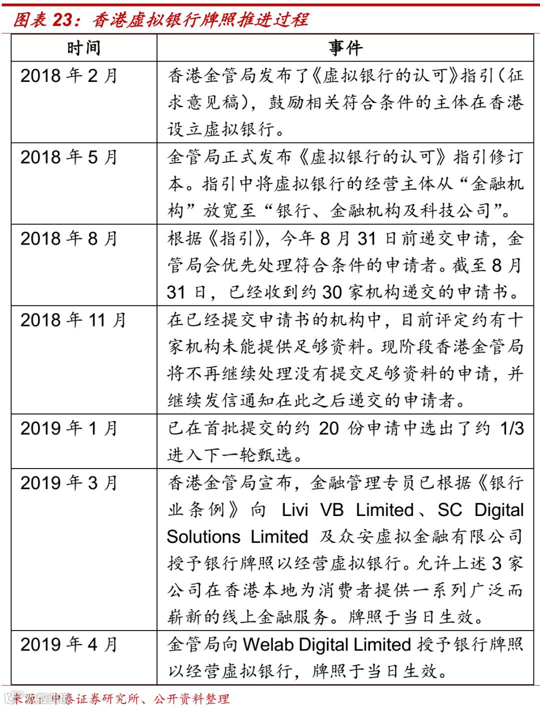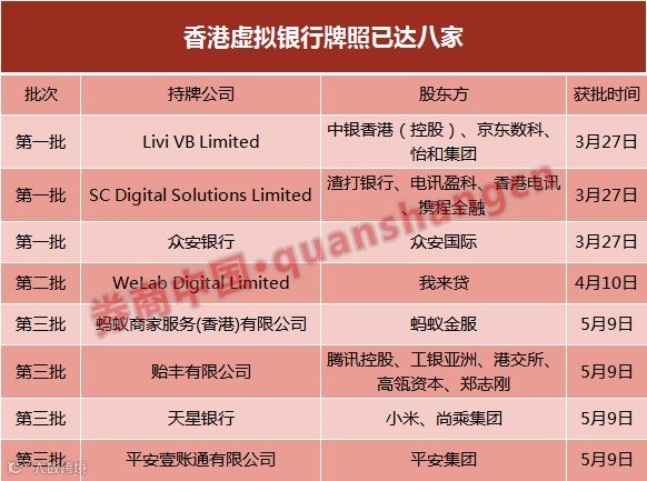 当前,香港金管局先后下发了8张虚拟银行牌照,包括,去年3月27日首次下发虚拟银行牌照,获批的3家公司为Livi VB Limited(中银香港、京东数科等合资)、SC Digital Solutions Limited及众安虚拟金融有限公司(众安银行)。4月10日,金融科技公司Welab Digital Limited获得第4块虚拟银行牌照。5月9日,蚂蚁商家服务(香港)有限公司、贻丰有限公司、洞见金融科技有限公司及平安壹账通有限公司授予银行牌照以经营虚拟银行,牌照于当日生效。