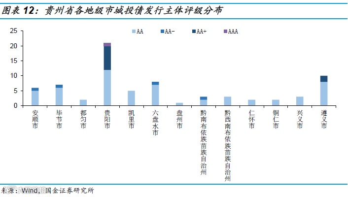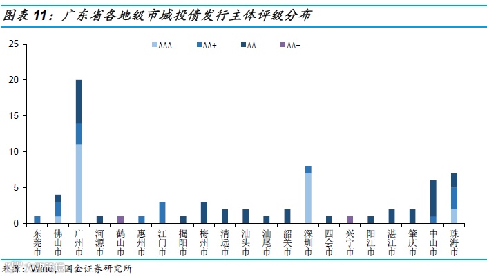 总体上来看,广东省全省及各地级市城投债的发行规模大于贵州省。评级角度,广东省城投债发行主体评级整体高于贵州省,对比两省城投债发行规模排前两位城市,贵阳市AAA级8只,AA+级22只,AA级13只,广州市AAA级67只,AA+级2只,AA级10只;遵义市AA+级2只,AA级11只,深圳市AAA级24只,AA+级1只。两省较大的经济发展水平和财政实力差距,使得城投债的评级存在较大的差异。