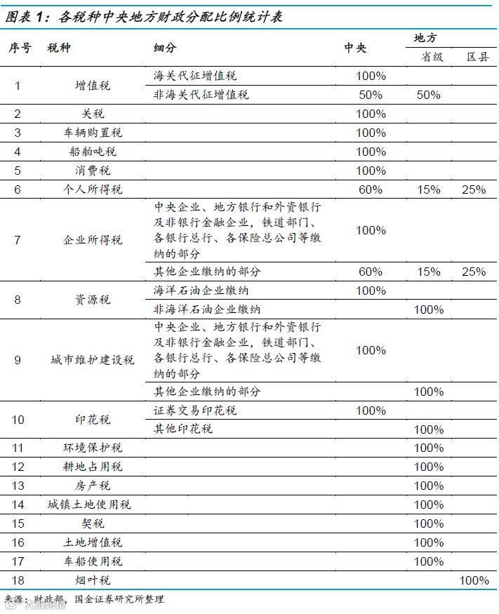 一般公共预算总收入分为税收收入和非税收入。税收收入包括增值税、消费税、企业所得税和个人所得税等18个税种收入(包括环境保护税,不含营业税[2]),不同项目税种收入需要按照对应的税收分成比例在中央和地方之间进行切分。具体来看:1)中央固定收入如消费税,需要全额上划中央;2)地方固定收入如房产税、契税等,全额归属地方;3)中央、地方共享收入如增值税、所得税等,则按照固定分成比例(增值税50:50,所得税60:40)。此外,省、市、县各级政府之间也有一定的分成比例,如个人所得税地方分成的40%中,15%属于省级,25%属于区县级。